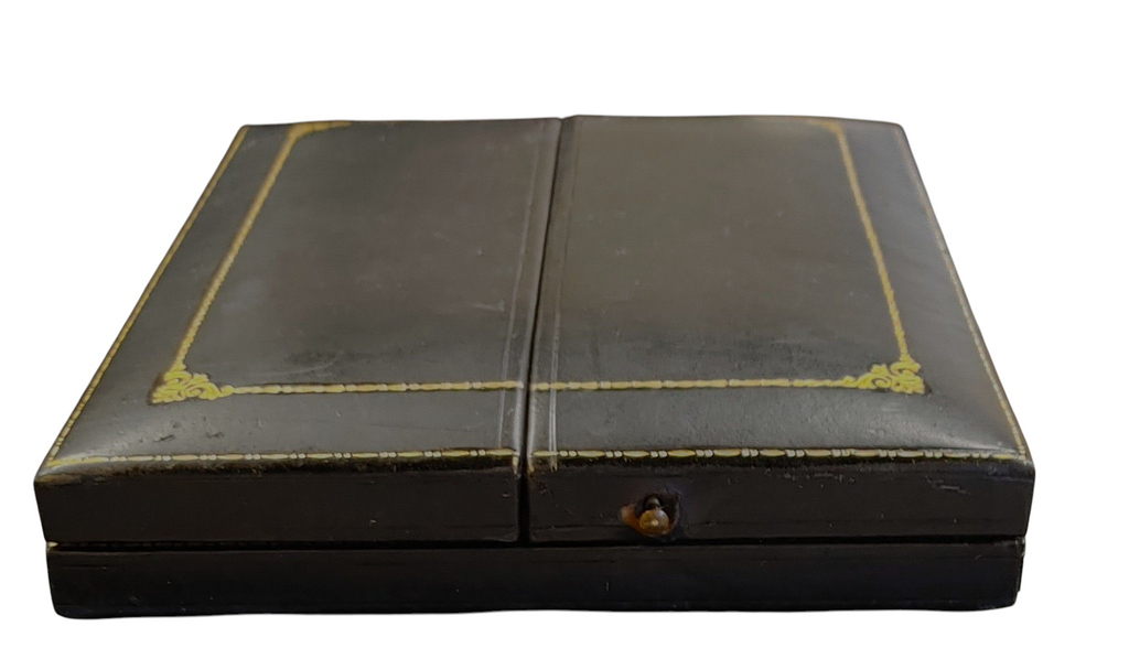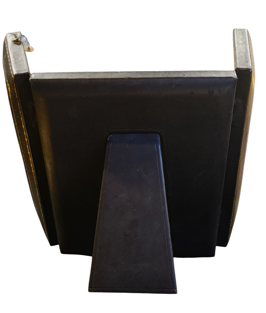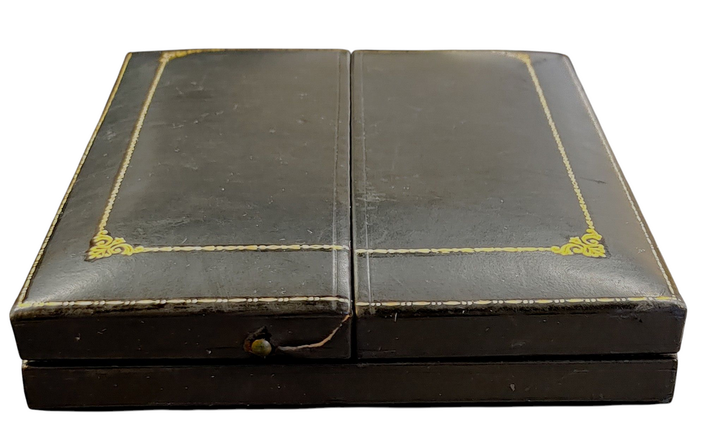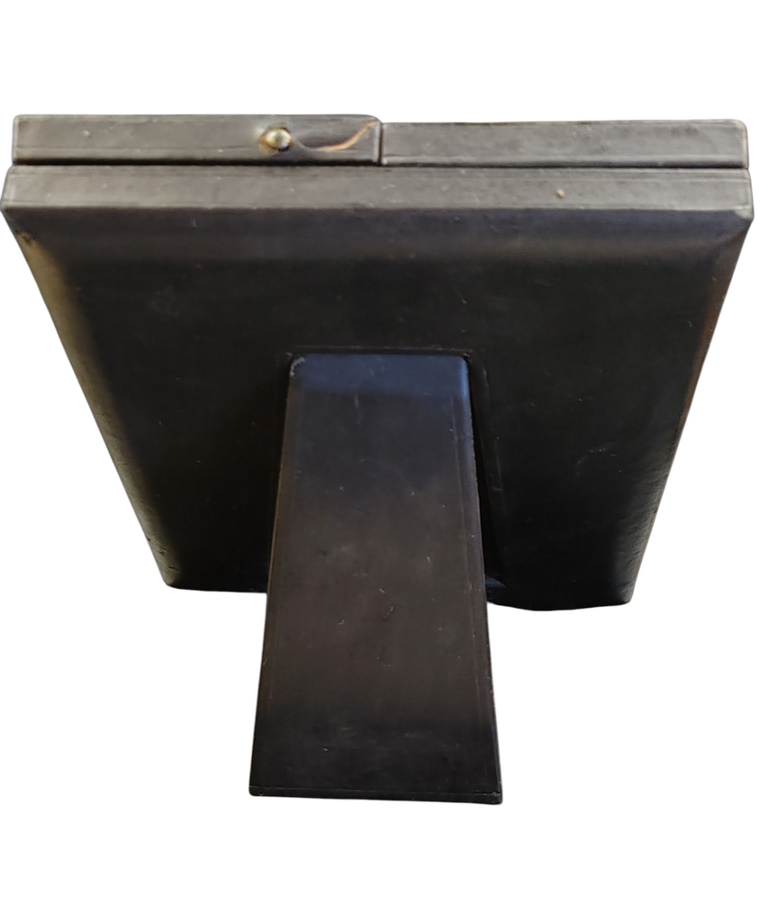 Beautiful antique miniature gold plated portrait frame with folding leatherette case with stand features a gold fabric interior with a small hook to hold the slightly convex glass frame in place. Note that there is a small tear in the top of the case in the photos and minor staining on the interior fabric. This lovely piece is in otherwise very good antique condition and would make a rare and wonderful gift!
