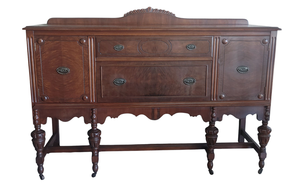 Gorgeous 1920s Jacobean Revival sideborad with carved details and decorative backsplash features 2 deep drawers and 2 acbinets behind doors set on a supportive strecther base and casters! This beautiful walnut piece offers so many functional possibilities in your home or office! Good preowned condition with minor wear consistent with age and use.
