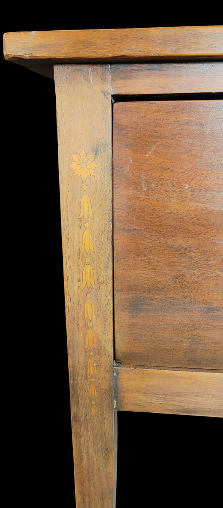 Handsome antique hunt board that's all about statement! It's elegant in form and rustic in finish. Some say hunt boards originated in mudrooms where the "womenfolk" left refreshments for the men after a hunt. And the height was ideal for those on foot or horseback. This fabulous piece features hand-cut dovetails with delicate bellflower inlay along tall tapered legs. Two deep drawers offer storage for your table linens and flatware. She's perfect for entryway, the dining room, country kitchen or coffee bar!