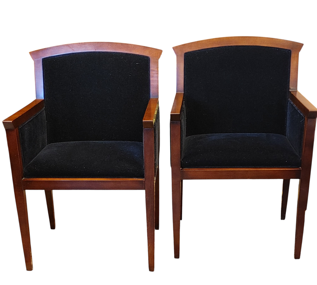 Inspired by Art Deco design, this set of solid wood arm chairs feature clean lines draped in a black velvet-like upholstery. Originally designed for commercial use, the frames are solid offering comfort and durability lending themselves to so many design possibilities for home or office! Excellent preowned condition with minor wear consistent with age and use.