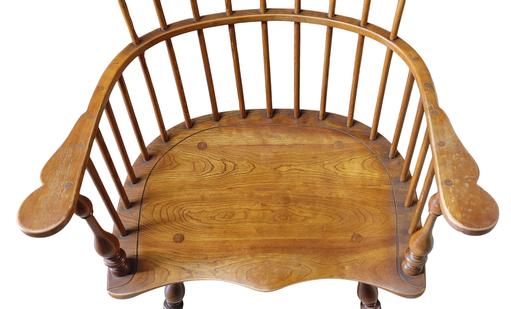 Vintage cherry Windsor chairs by Stickley Furniture. These classic and durable frames feature a high "comb" back, curved arm rests, turned legs and a generous 17" wide seat. Very popular English chairs during the 18th and 19th centuries, they were reproduced in the US during the mid-20th century. Need a pair of versatile chairs to enhance your interior aesthetic? These timeless chairs check all the boxes from country/cottage, farmhouse, rustic, traditional, craftsman and primitive! Surprising comfort meets historical style! Good preowned condition.
