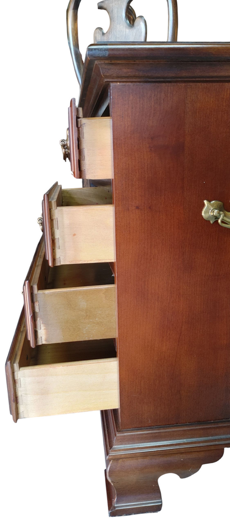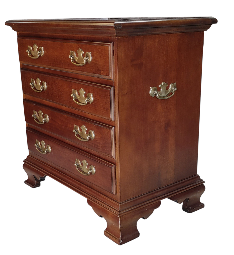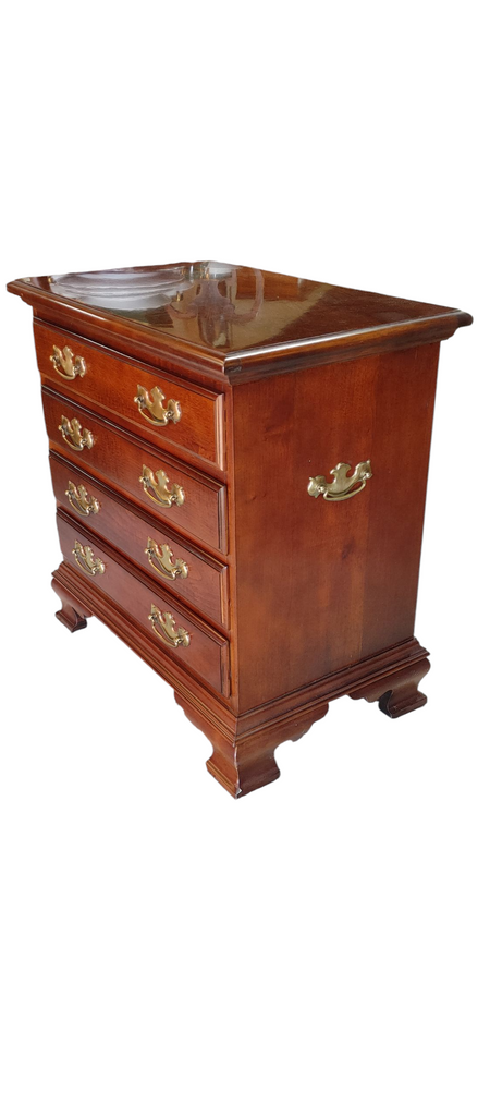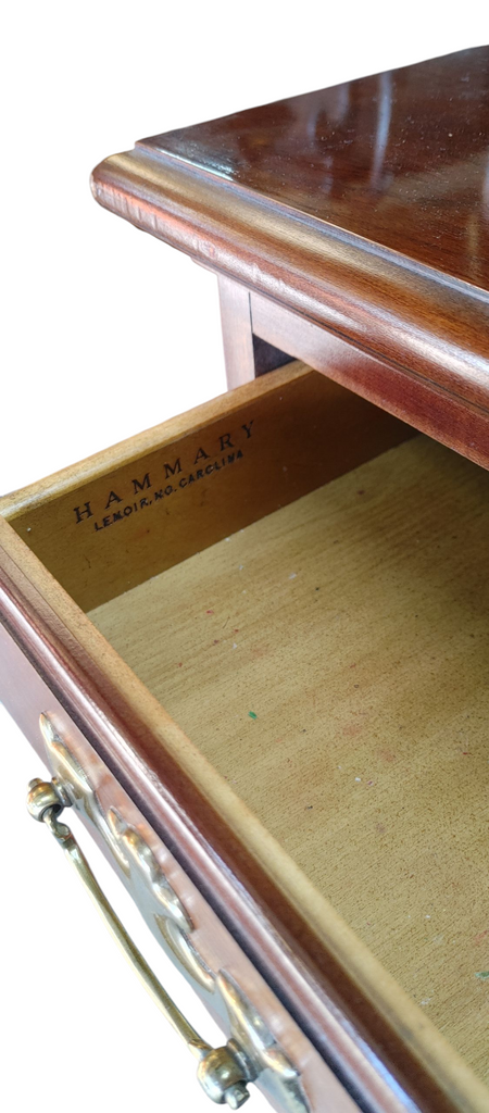 This timeless and traditional Chippendale style bed side chest by Hammary is quality crafted in rich mahogany featuring 4-dovetailed drawers ensuring durability and a smooth glide for years to come,  beautiful brass batwing pulls, a fully finished back allowing versatility in placement and rests on handsome bracket feet. This chest is in excellent preowned condition with minor wear consistent with age and use.