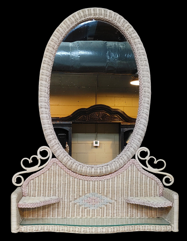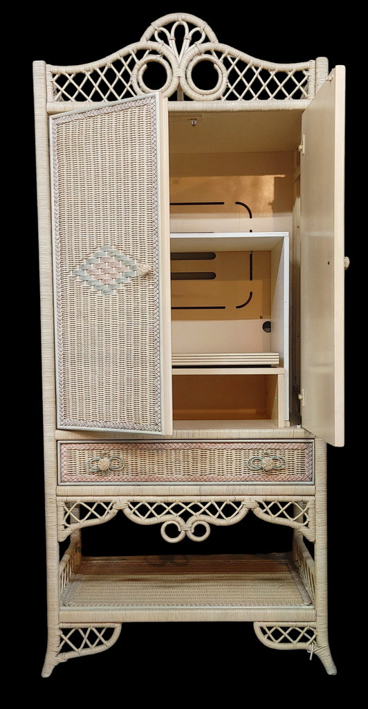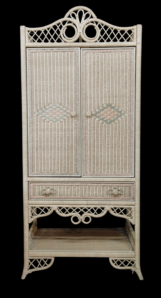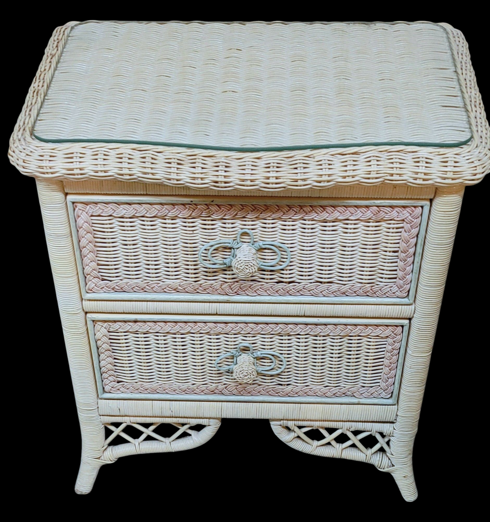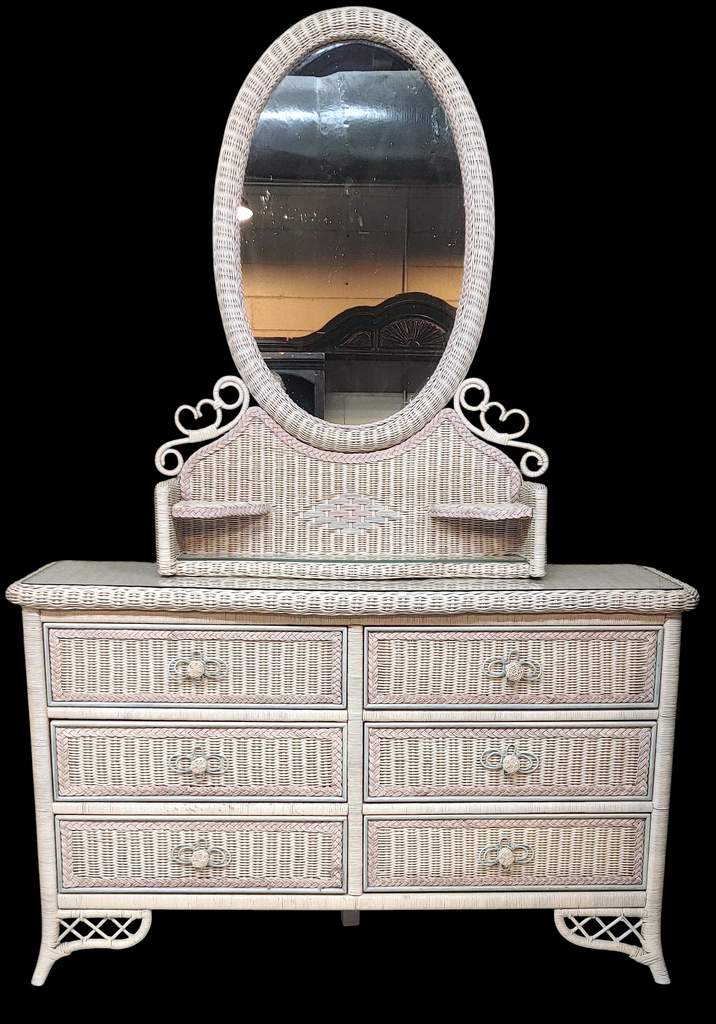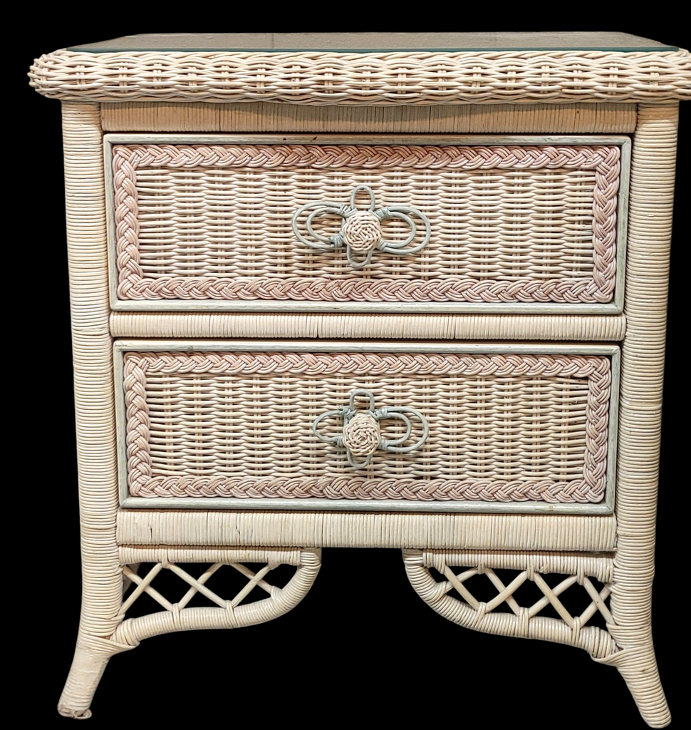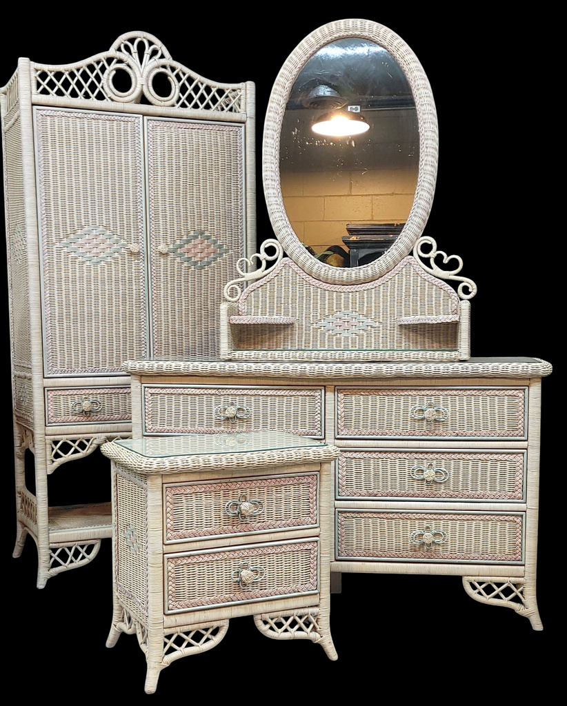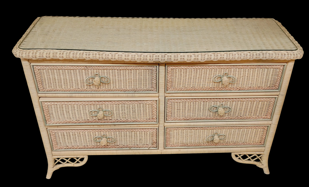 Beautiful vintage Heny Link winker bedroom suite that's so versatile! Whether you're furnishing the nursery, the perfect princess room, beach houses or themed rental, this group is worth considering! It's crafted in a nuetral high quality wicker, trimmed in subtle pink and sage green and it exudes a lovely light and airy feel. The set includes a 2-door media cabinet with a single drawer and lower shelf (easily transforemed into a wardrobe or coffee bar for that matter), 6-drawer dresser with removable vanity mirror and a 2-drawer night stand. (Dresser, vanity and nighstand also include protective glass tops). This gently-loved ensemble is ready for a new space!