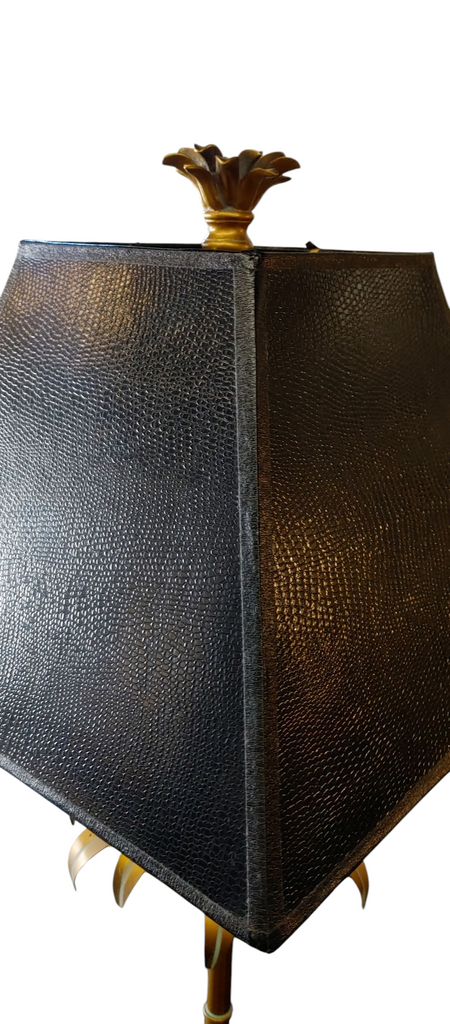 Beautiful designer palm tree themed table lamp! Crafted in matte gold metal, this lamp features decorative frons at the base and collar and snakeskin embossed lamp shade that adds instant sophistication to your space! Excellent preowned condition.