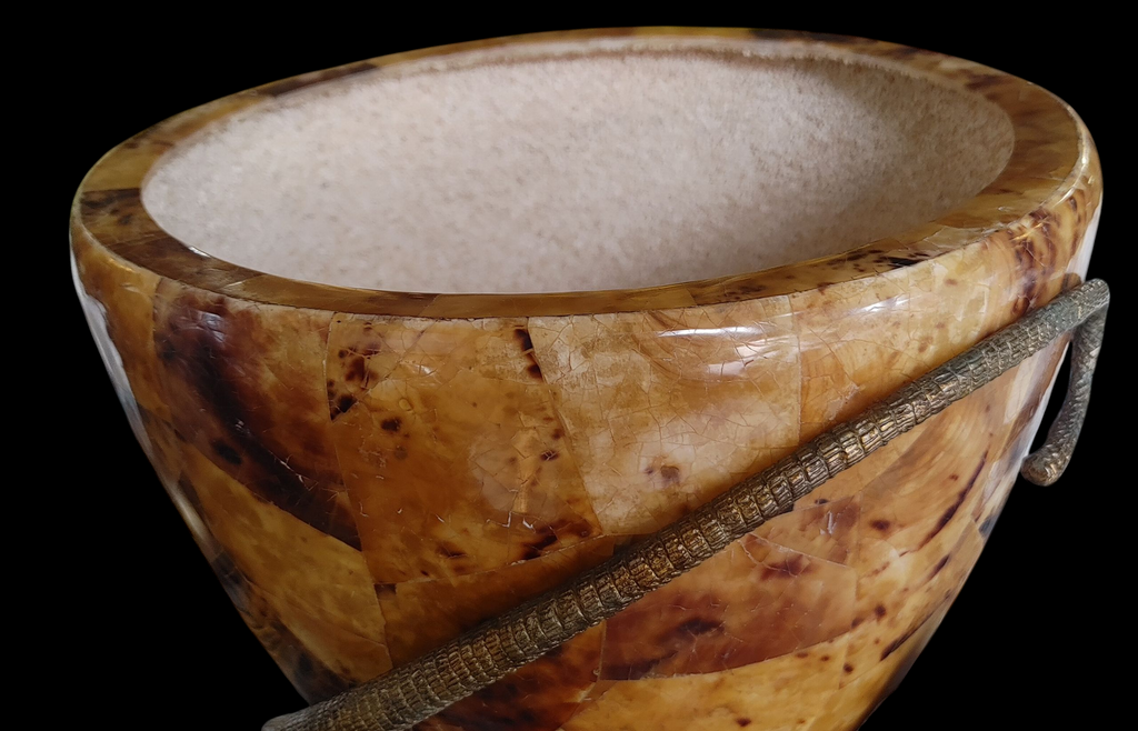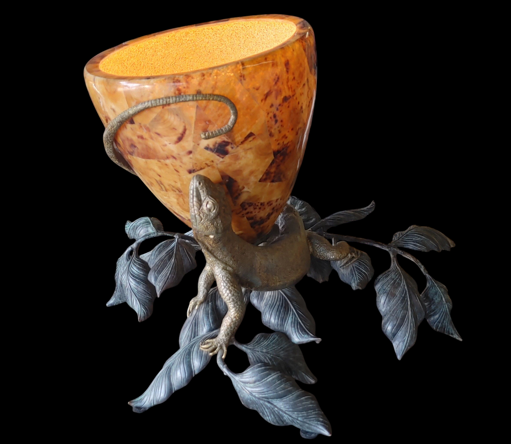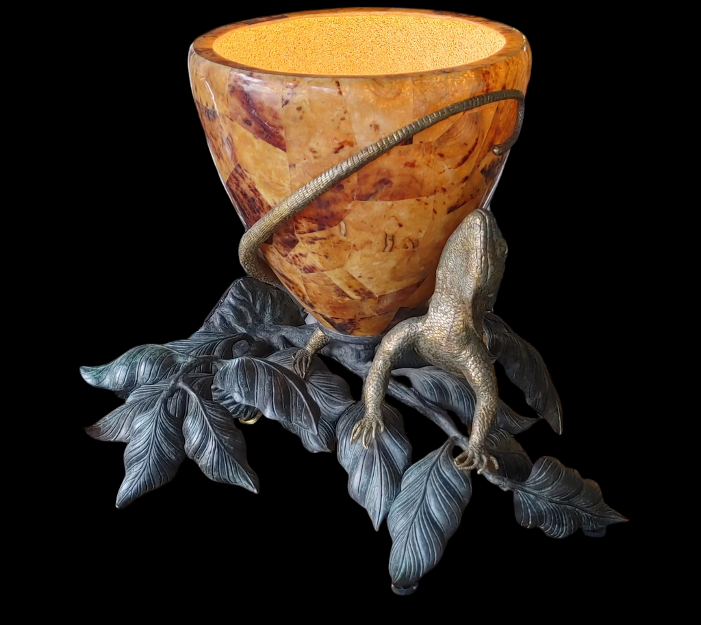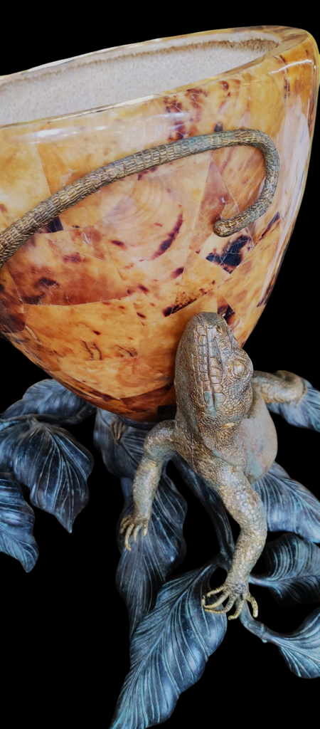 Extraordinary 1970s iguana wall sconce by Maitland Smith! This piece features a cast bronze/brass design displaying a nice aqua/green patina. The iguana lizard lounges on leafy branches wrapped around an inlaid penshell globe. This is a high quailty, highly detailed piece that you'll love mounted on the wall or as a fascinating centerpiece. It is in excellent preowned condition.