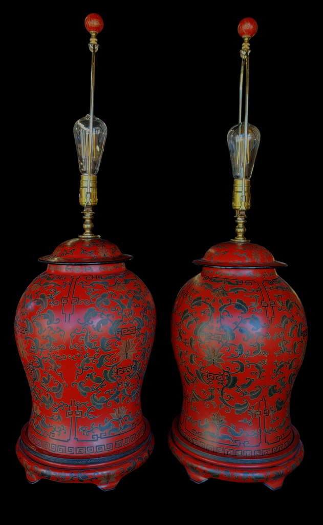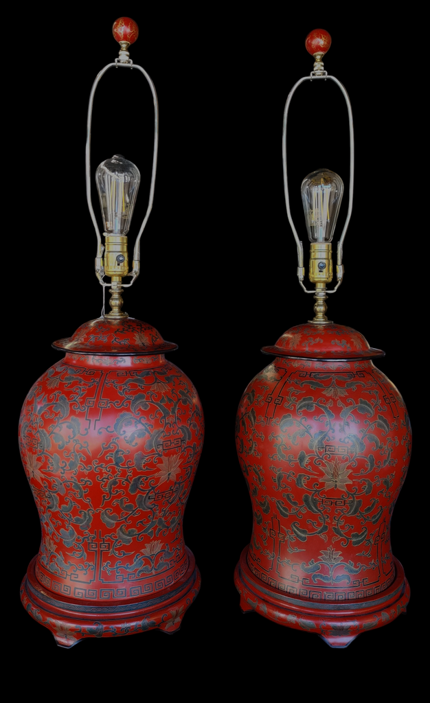 PAIR Chinese Red Lacquer Cinnabar Ginger Jar Table Lamps