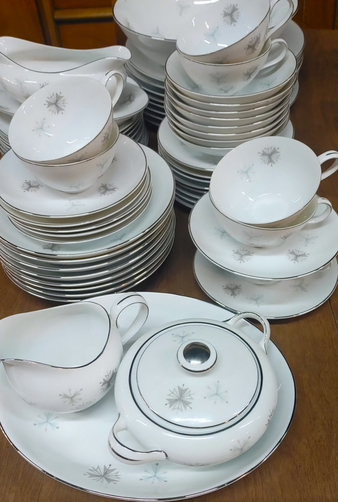 Pristine mid-century dinnerware features an aqua and silver atomic starburst/snowflake design on a smooth white field with a platinum rim. This porcelain dinnerware was crafted in Japan for export during the 1950s and 1960s and is in high demand for its mid-century aesthetic. Service fo 6 + extra pieces - 55 pcs. Excellent preowned condition.