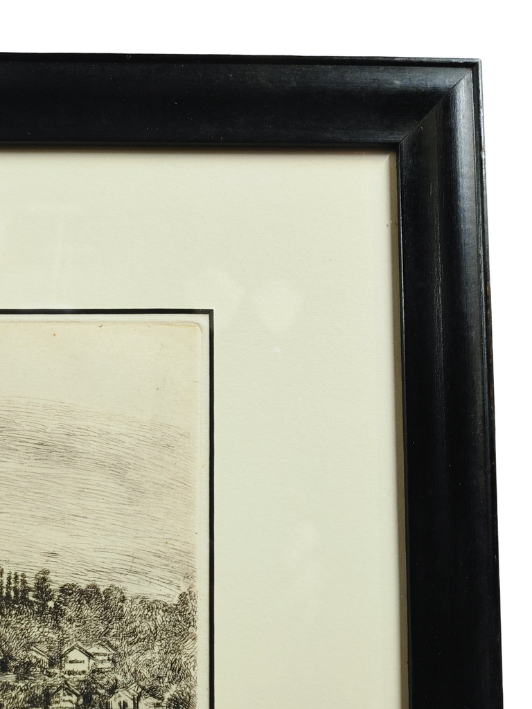 Signed original lithograph depicting what appears to be an Olde World European village scene. Hand-signed in pencil on the bottom left "Original Radierung" (German, original etching). Also Pencil-signed by the artist on the right corner. Matted and framed in a simple black wooden frame. Excellent preowned condition.
