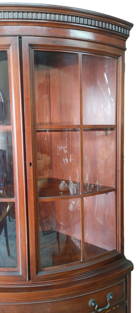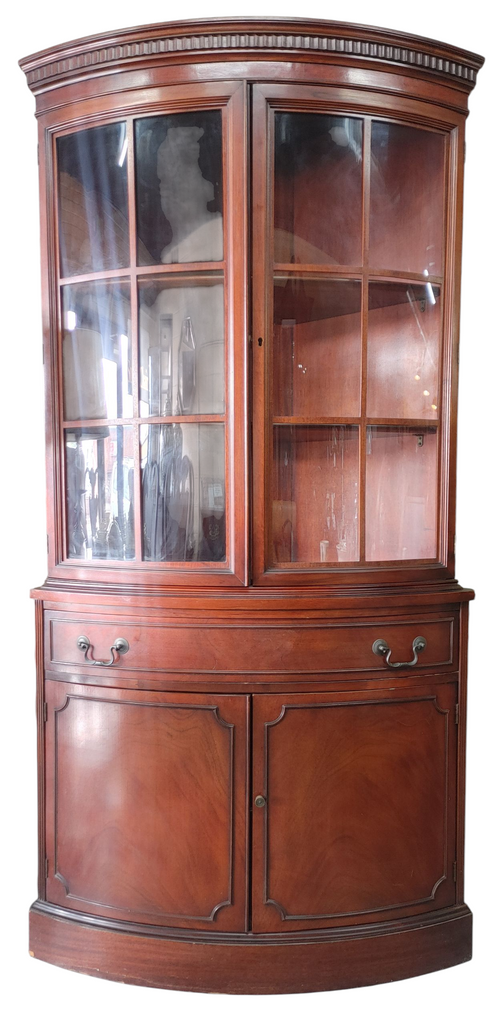Timeless and traditional wood corner cabinet offers two removable shelves behind curved glass doors in the upper cabinet, a middle drawer and additional storage in the lower cabinet hidden behind solid doors. Finished in a warm cherry stain with nice moldings that set it apart! Display your prized china or cherished collectibles in this beautiful piece!